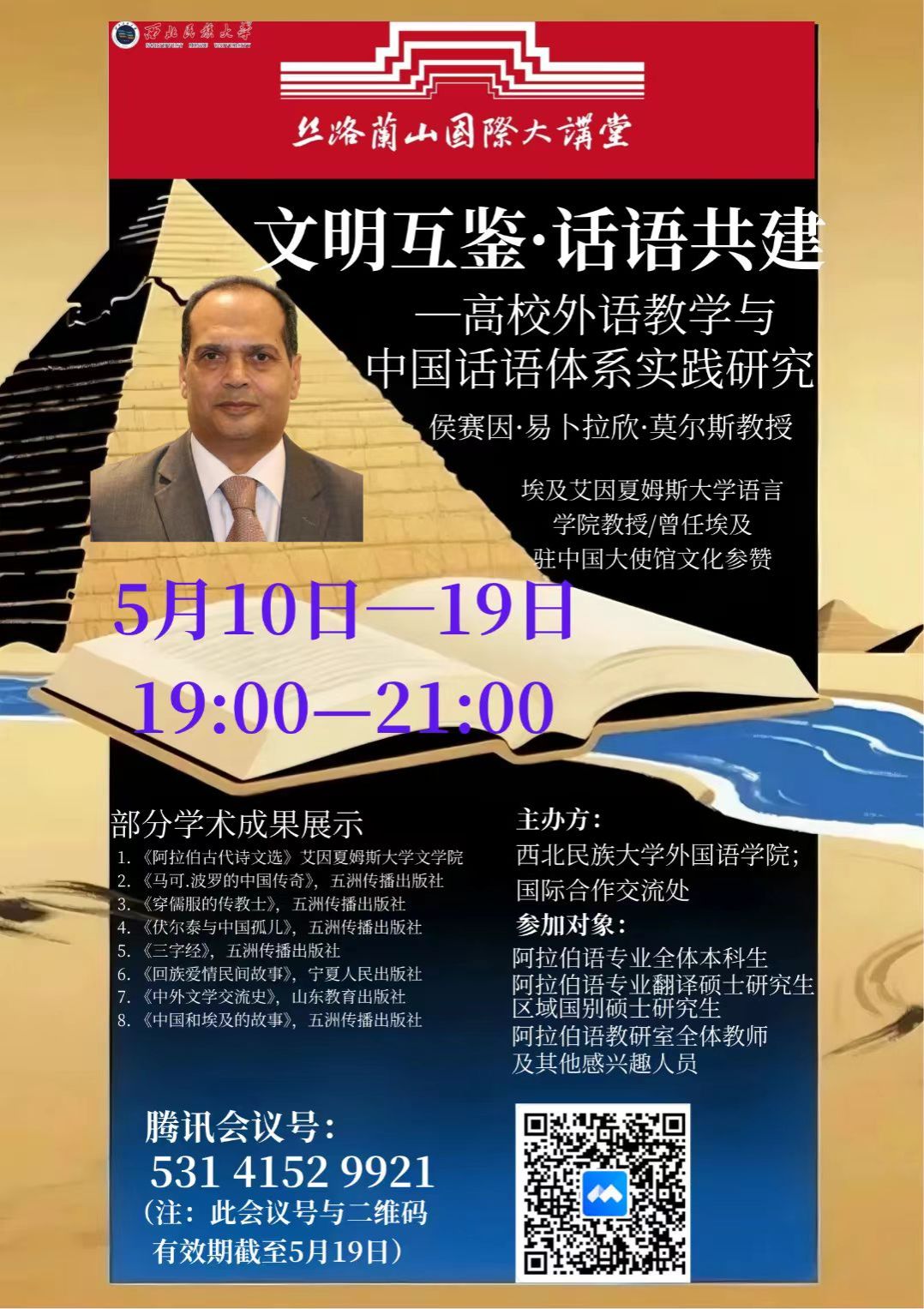 為積極引進國外優質教育資源,深度服務人才培養戰略,大力推進一流學科專業建設,西北民族大學外國語學院阿拉伯語系承辦本期“絲路·蘭山國際大講堂”。2025 年 5 月 10 日至 19 日,來自埃及艾因夏姆斯大學語言學院的知名教授、著名翻譯家、前埃及駐中國大使館文化參贊侯賽因·易卜拉欣·莫爾斯教授,通過線上平臺為我校阿拉伯語專業師生帶來了一場為期 10 天的學術盛宴。