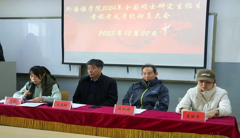 隨著2024年全國碩士研究生招生考試的臨近,外國語學院高度重視考試工作,為確保考試的公平、公正和順利進行,我院于2023年12月20日中午在榆中校區致美樓316會議室,召開全國碩士研究生考試考風考紀動員大會。學院黨委書記豆存祥、黨委副書記馬佳、副院長馬和斌以及輔導員康維華出席了會議,本次大會由馬佳副書記主持。