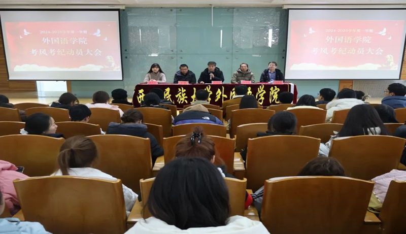 2024年12月16日,外國語學院于致真樓101、102教室成功舉行了考風考紀動員大會,黨委書記豆存祥、黨委副書記馬佳、副院長馬和斌、副處級輔導員黎林、教學管理辦公室主任李東海、楊麗霞、團委書記袁嘉、輔導員康維華、董巖以及全院學生參加了本次大會。