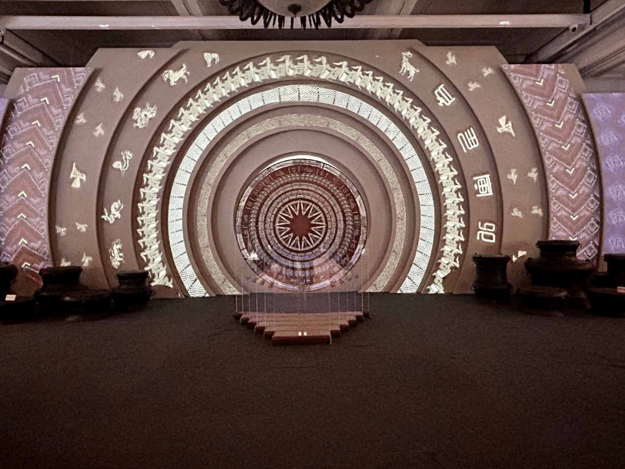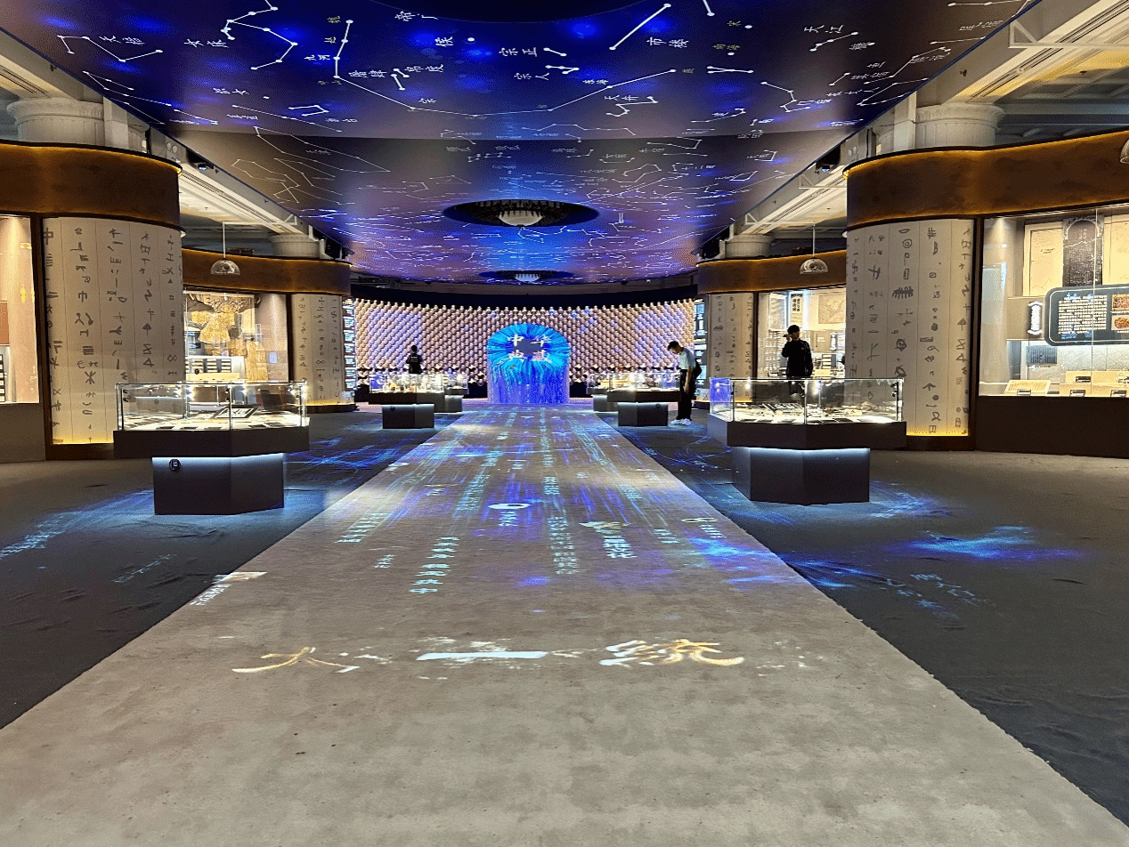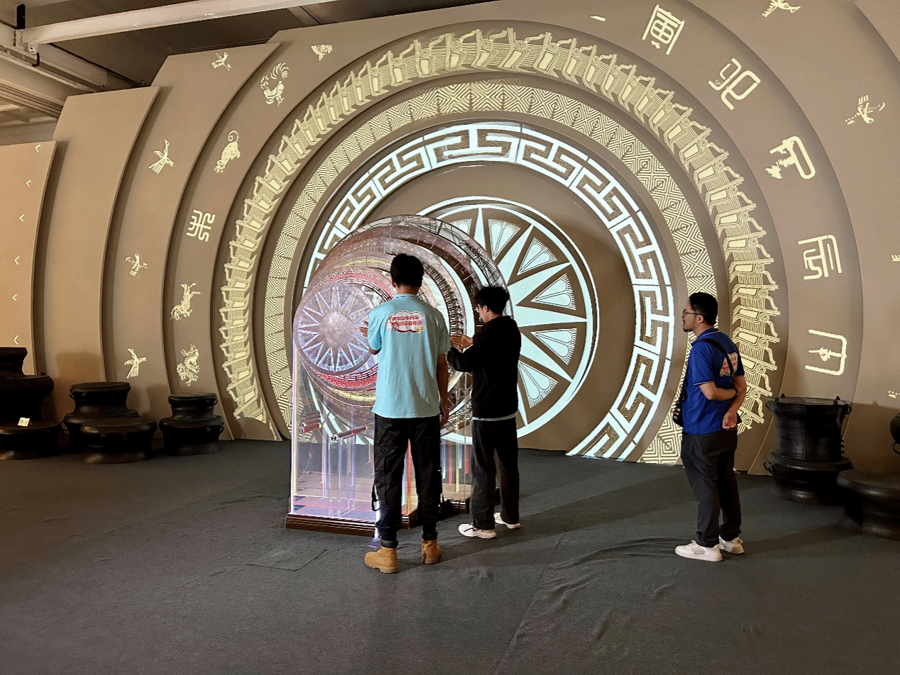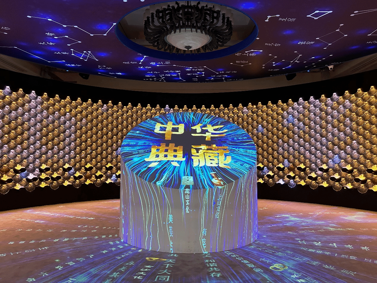 在這個展廳,頭頂上方是古絲綢之路地圖,腳下是“四大民族走廊”,還能在“同心共振”互動專區聆聽各民族音樂的交響。當人們用手掌長按鼓面的時候,就能點亮它,在大屏上出現白鶴、麥穗等特效。鼓面共有六個,需要大家一起合作,才能全部點亮,呈現出龍鳳呈祥的效果。