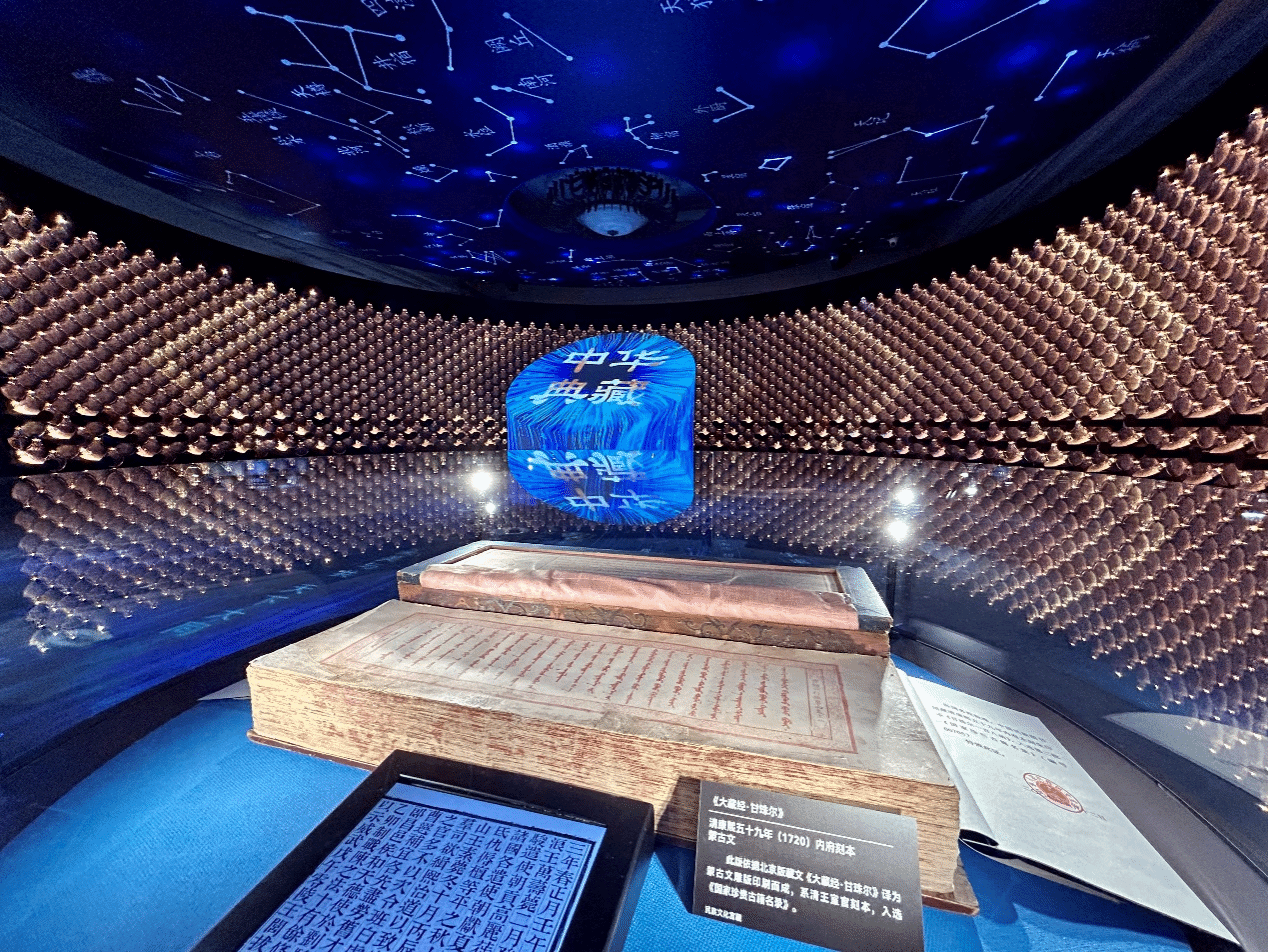 古籍墻以花瓣為設計造型,瓣瓣同心。每一片花瓣中各民族珍貴的典籍文字,流淌到中間的集思柱上,象征著各民族文化在交往交流交融中互學共鑒,構筑了多元一體的中華民族文化。頭頂的星空圖,寓意著千年文脈綿延不斷,中華文化生生不息。