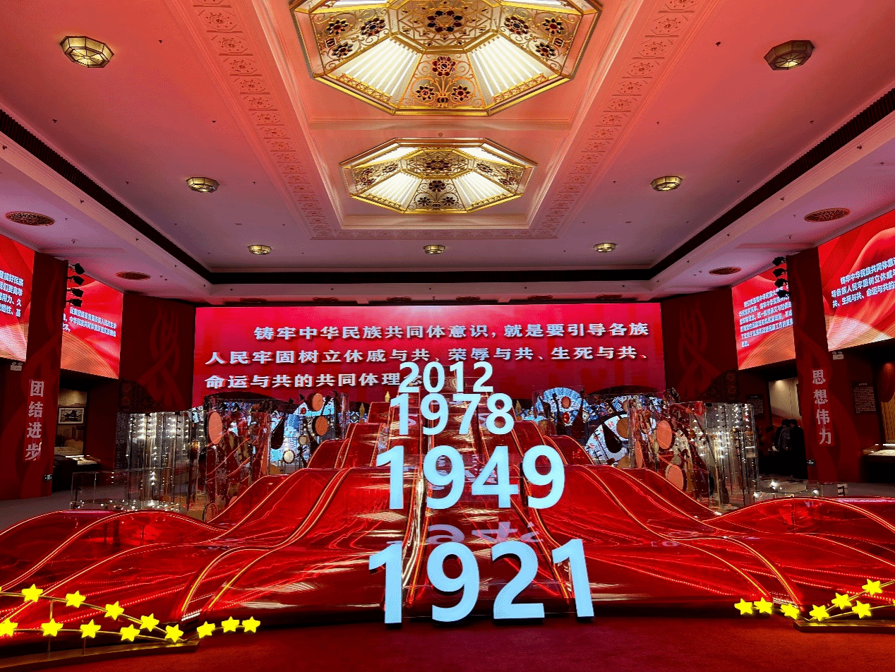 在“大團結”單元,象征“一片紅心心向黨” 的紅旗海浪在展廳翻涌,“1921”“1949”“1978”“2012”四個數字立于其上,分別對應著中國共產黨誕生、中華人民共和國成立、改革開放、十八大召開這四個里程碑式事件。層層推高的波浪代表我們黨在蜿蜒起伏的歷史長河中帶領全國各族人民走向新時代。
