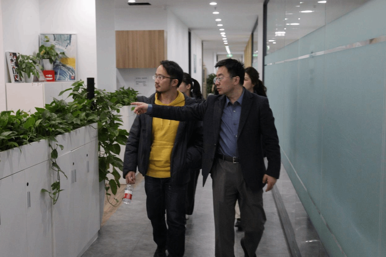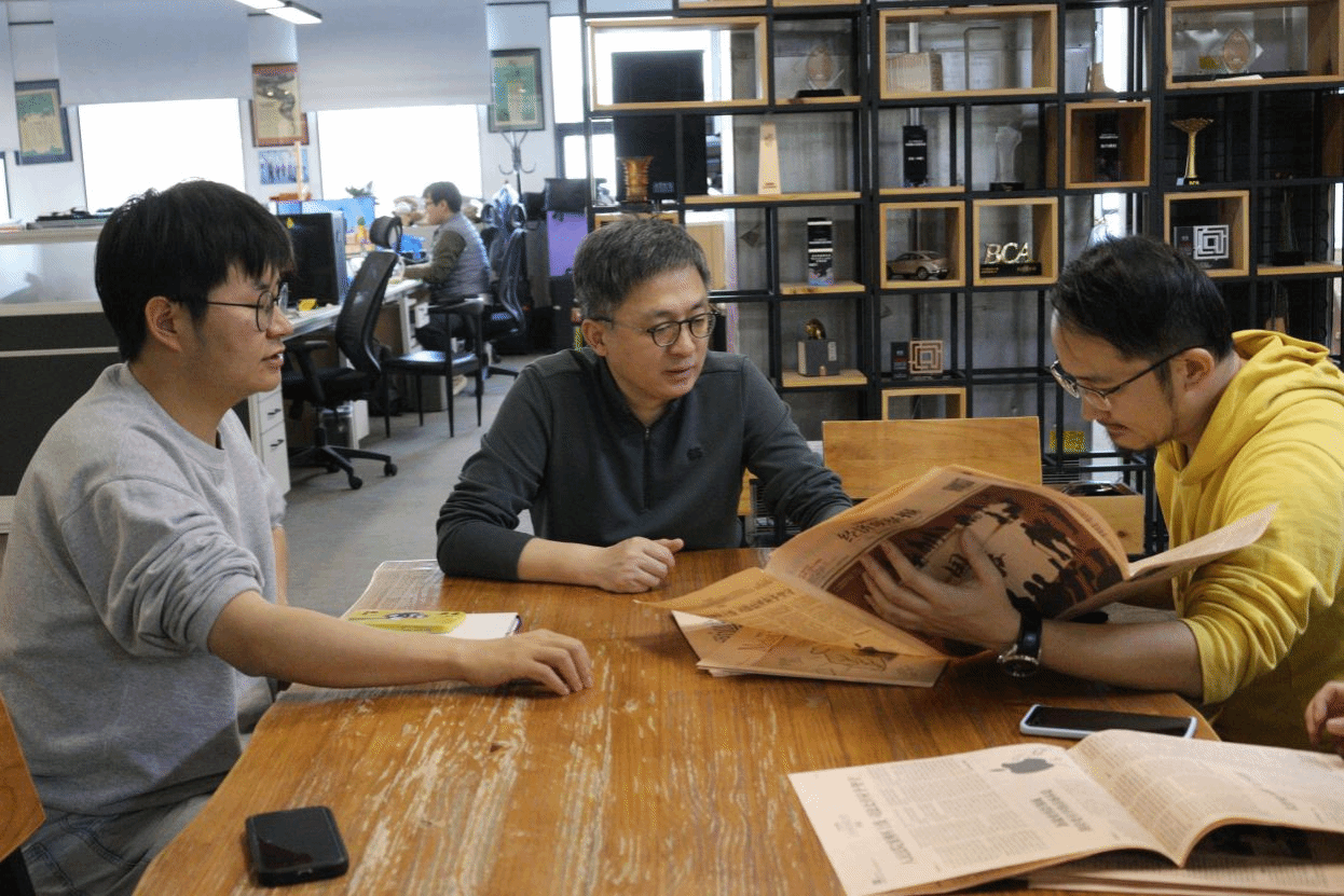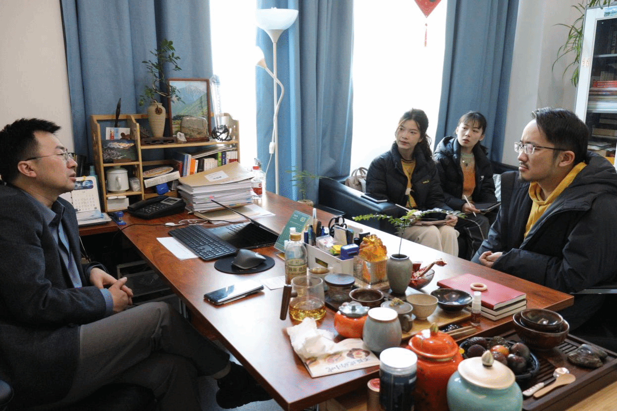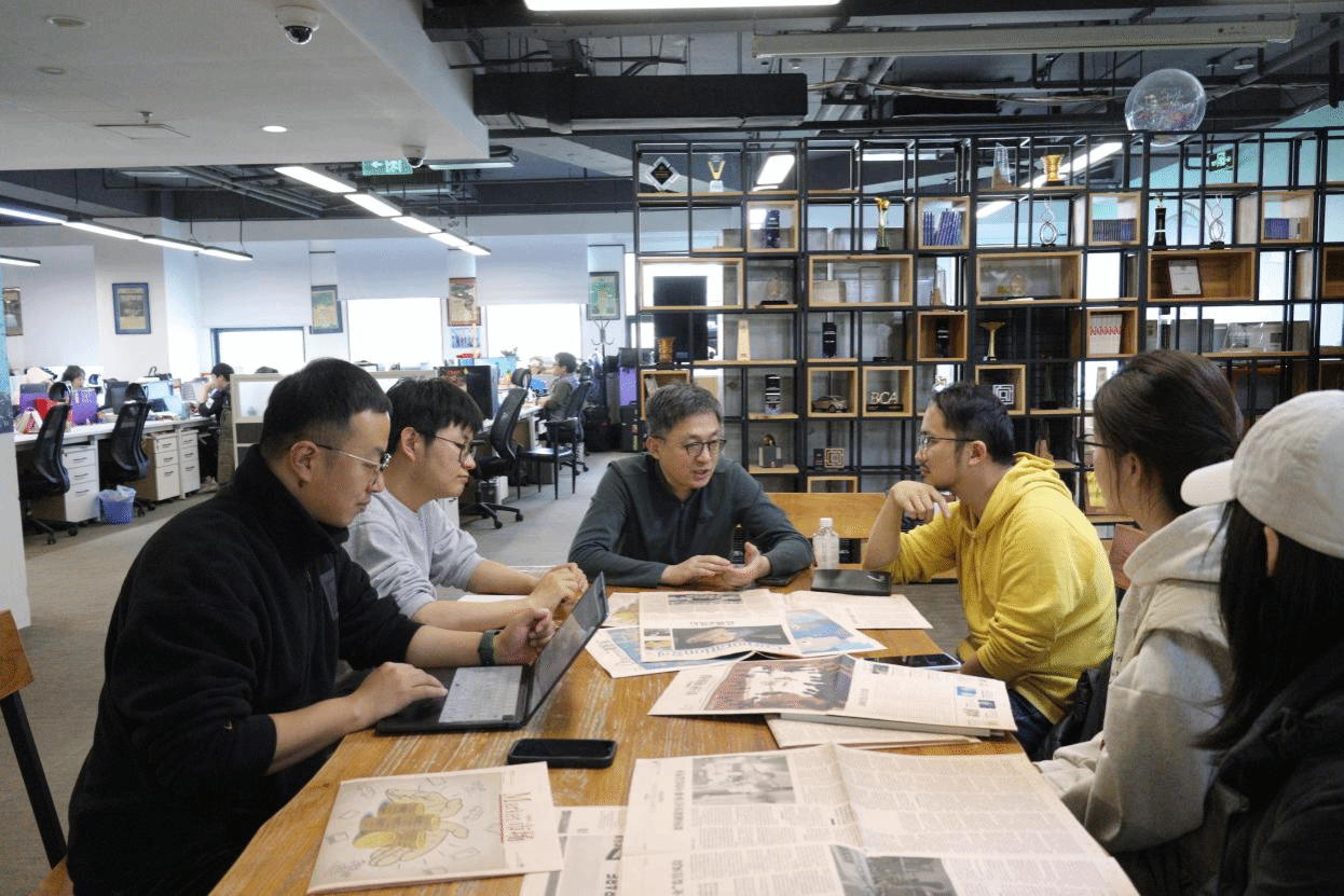 (云聽總編輯張顯峰與實踐團隊在辦公室內交流)