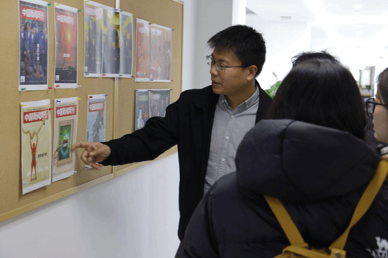(中新社相關負責人向實踐團隊介紹其雜志封面)