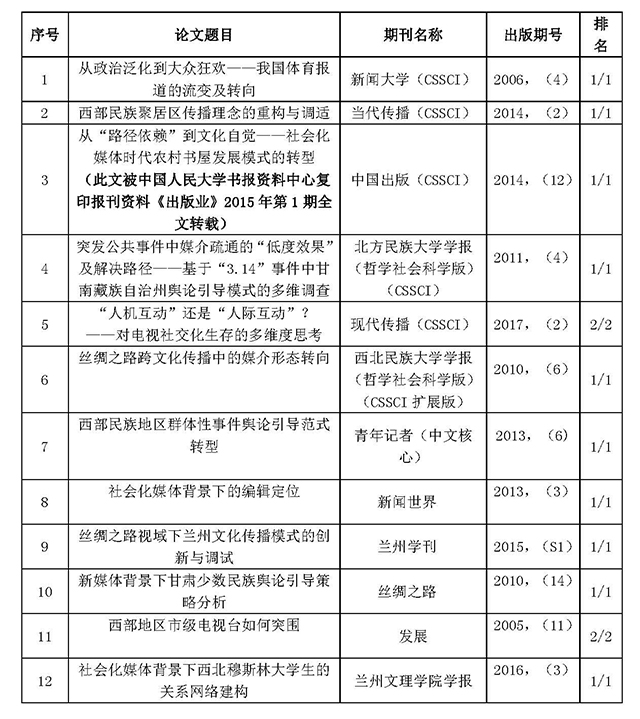 1.論文《突發公共事件中媒介疏通的"低度效果"及解決路徑--基于"3.14"事件中甘南藏族自治州輿論引導模式的多維調查》獲甘肅省第十三次哲學社會科學優秀成果獎三等獎(2013年3月)