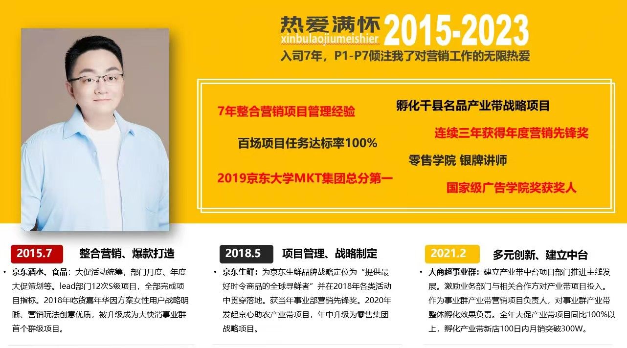 2011級廣告學班長。本科畢業至今就職京東集團9年,現職級副總監。操盤百場項目實戰任務達標率100%;京東大學銀牌講師(品牌與創意營銷、時勢營銷方向);多項集團戰略項目發起人及負責人;2020年-2021年疫情期間全網發布《告全國農人書》發起京心助農項目,幫助150萬戶農人賣出超過3億件農貨,幫助農人共克時艱。項目當年登央視新聞聯播3次、焦點訪談1次、央視新聞等央媒86次;