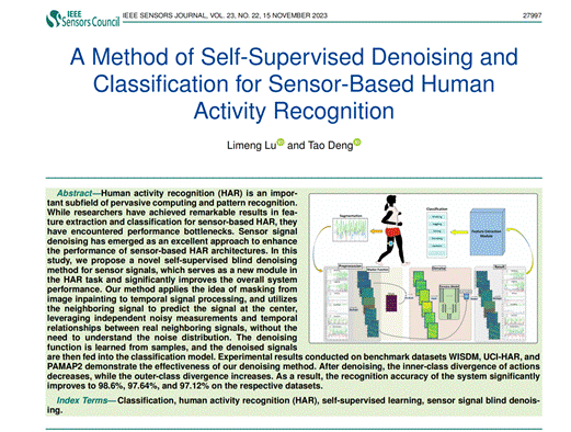 中國民族信息技術研究院研究生陸禮盟的最新研究成果《A Method of Self-Supervised Denoising and Classification for Sensor-Based Human Activity Recognition》被SCI期刊IEEE Sensors Journal(JCR: Q1,中科院2區(qū)Top期刊,IF=4.3)接收,于2023年11月15日正式發(fā)表,該期刊是信號處理與傳感器技術領域的國際知名期刊,具有較高的認可度。團隊負責人鄧濤教授為通訊作者,其指導的碩士研究生陸禮盟為第一作者,該論文是團隊研究多模態(tài)人體活動識別技術的階段性成果。論文地址為:https://ieeexplore.ieee.org/document/10286345。