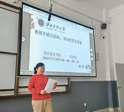 3月31日下午,預科教育學院蔣新慧老師在致真樓106 教室舉辦了主題為“中國詩詞流變與創新”的教授開放日活動。此次活動通過講析經典詩詞、組織學生互動背誦等形式,讓現場同學領略到了中華詩詞文化的獨特魅力。