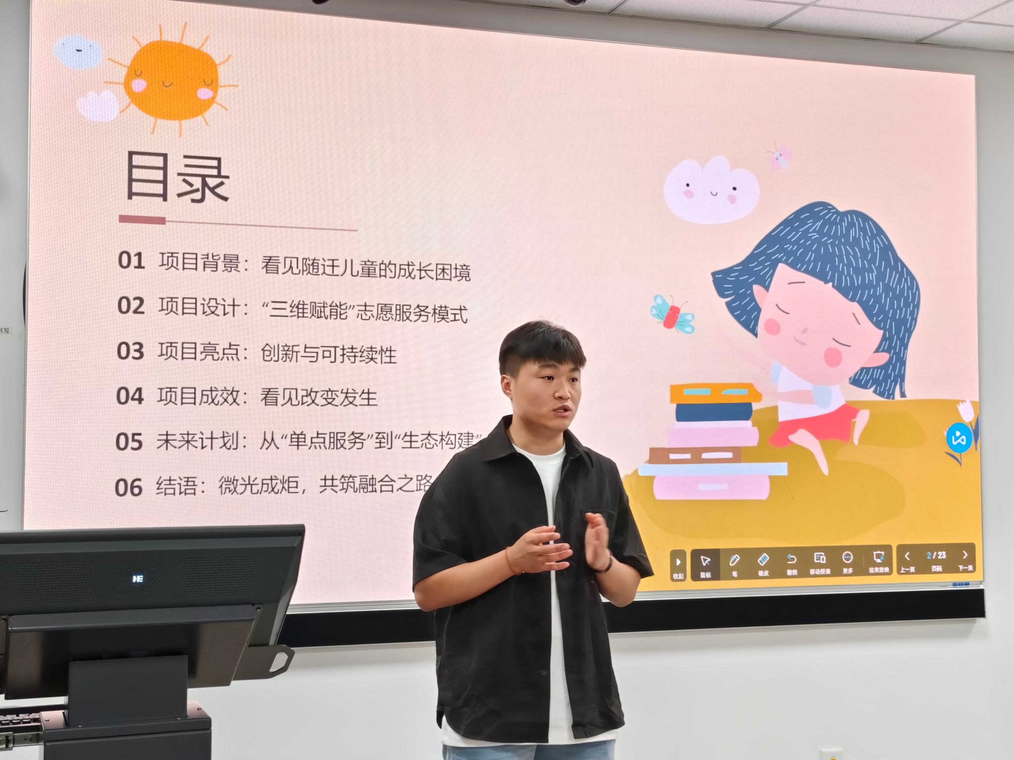 大賽自啟動以來,得到了各學院的積極響應與同學們的廣泛參與。經過初賽激烈遴選,最終9個優秀項目脫穎而出,成功入圍決賽。決賽現場,各項目團隊負責人通過精心制作的PPT展示,將項目的背景、目標、實施情況、創新點以及取得的成效等一一呈現。生動的案例講解仿佛將觀眾帶入了項目實施的真實場景,富有感染力的演講更是點燃了現場的氣氛。有的項目聚焦鄉村振興,致力于為鄉村發展注入新的活力;有的項目關注環境保護,倡導綠色生活理念;還有的項目圍繞文明實踐、關愛少年兒童、為老服務、陽光助殘、衛生健康等多個領域展開,充分展現了民大學子關注社會熱點、積極服務社會的強烈責任感和使命感。