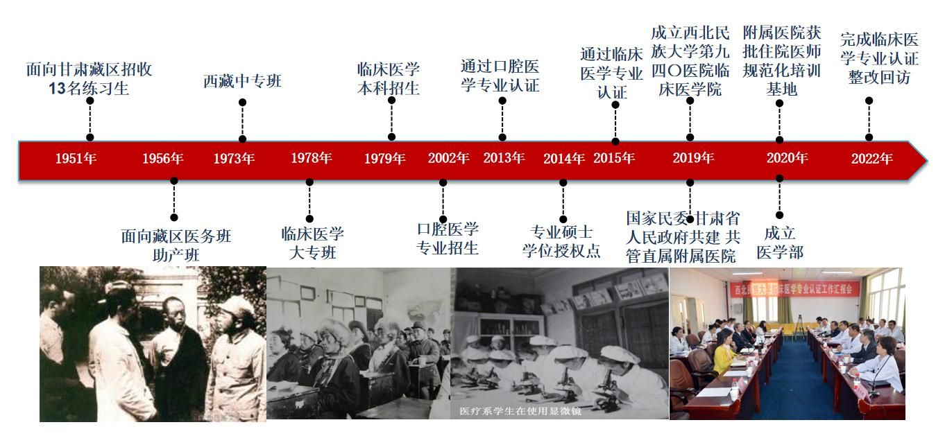 學校是國家民委直屬6所高校中唯一舉辦醫學教育的院校,對完善民族高等教育學科和專業布局具有特殊意義。學校醫學教育招生自1951年從練習生開始培養,1956年開辦了醫務班、助產班,1959年更名醫務科。1966年學校停辦,1973年復辦,同年設立醫務系。1976年7月設立醫療系。1978年醫療系招收第一批三年制專科生。1979年醫療專業開始招收五年制本科生。1989年12月,醫療系更名為醫學系。1991年醫療專業改革為臨床醫學專業。2000年4月醫學系、校醫院合并,成立西北民族學院醫學院。2002年開設口腔醫學專業并開始招收專科生;2003年開設高級護理專業并招收專科生;2005年開始招收護理學專業四年制本科學生;2006年開始招收口腔醫學專業五年制本科學生;2008年設立醫學人類學方向碩士點。2012年將醫學院、口腔醫學院、校醫院獨立設置。2014年開設醫學檢驗技術專業并招收四年制本科學生。2014年11月成立學校醫學教育管理機構——醫學教學管理部。2014年獲批臨床醫學碩士專業學位授權點。2024年獲批護理碩士專業學位授權點。2020年1月機構調整,將醫學教學管理部、醫學院、口腔醫學院(口腔醫院)、附屬醫院(臨床醫學院)合并成立醫學部。現有臨床教學基地6個,分別是西北民族大學口腔醫院、附屬醫院(甘肅省第二人民醫院)、聯勤保障部隊第九四〇醫院臨床醫學院、附屬臨夏州人民醫院、附屬蘭州市口腔醫院、蘭州市第一人民醫院。