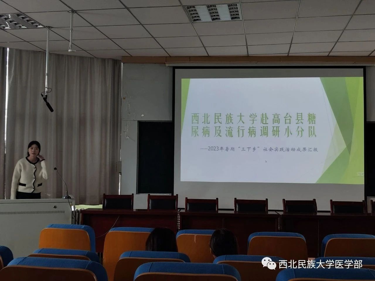 隨后,13支代表隊依次作了社會實踐成果分享。方鏡臣同學分享了張掖高臺縣糖尿病及流行病實踐團的實踐經歷,他們深入高臺縣城區部分衛生服務中心、巷道鎮衛生院及鎮轄13個村,對糖尿病人開展隨機調查問卷和數據采集工作。