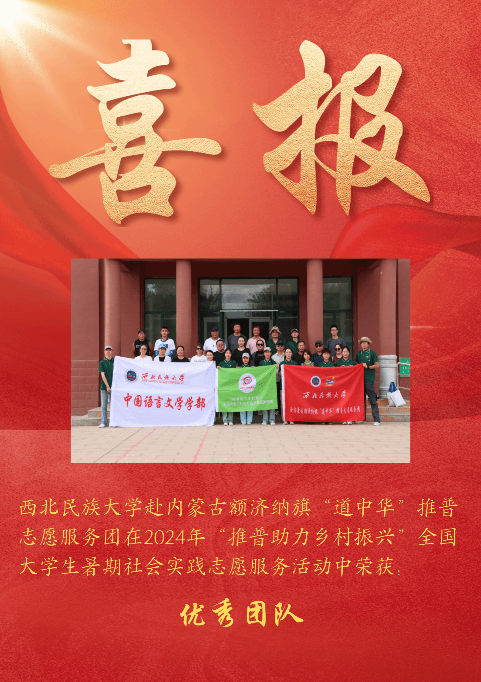 近日,教育部語言文字應用管理司和共青團中央青年發展部向西北民族大學發來表揚信,對中國語言文學學部在2024年“推普助力鄉村振興”全國大學生暑期社會實踐志愿服務活動中獲得優秀團隊表示祝賀,對所作出的積極貢獻予以表揚。