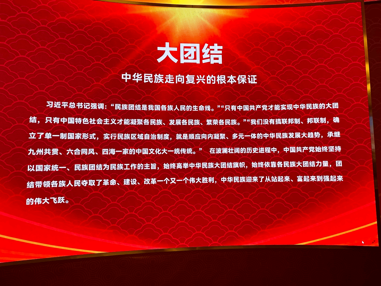 “大團(tuán)結(jié)”單元展廳主要展現(xiàn)中國(guó)共產(chǎn)黨從成立至今一脈相承的中華民族大團(tuán)結(jié)的深邃思想與豐富實(shí)踐。