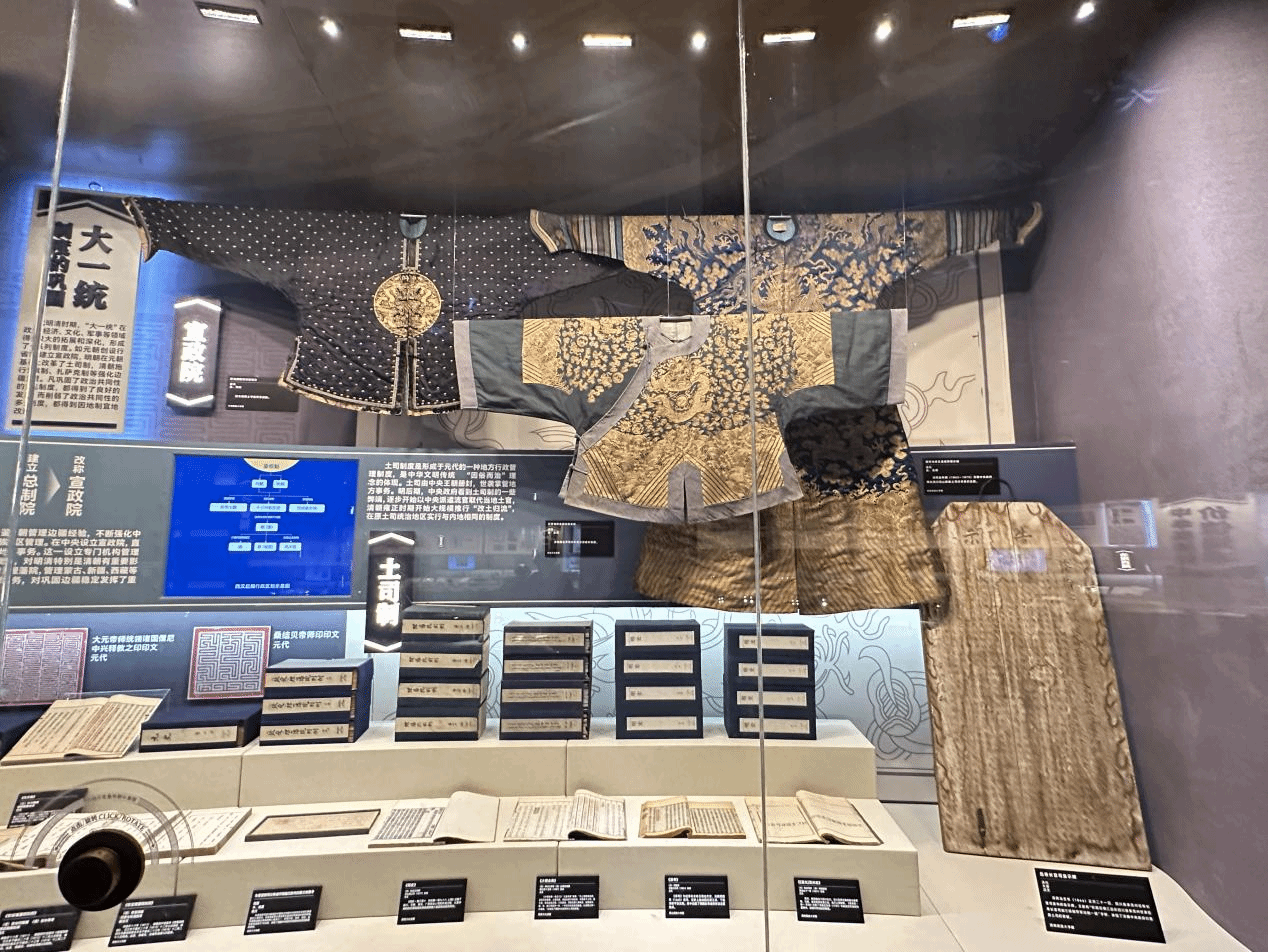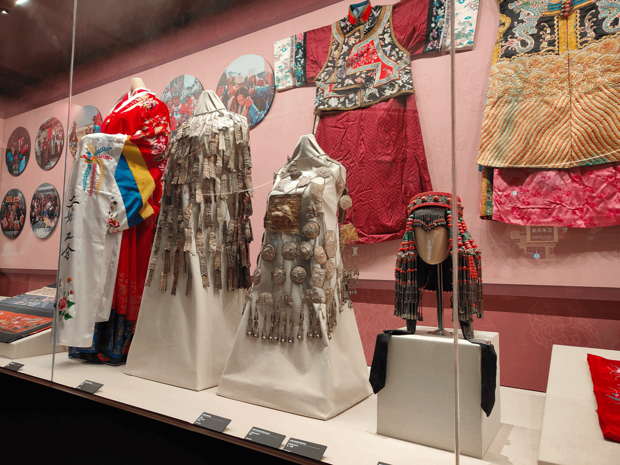 在此展廳,一系列的文物古籍,民族服飾都充分彰顯著中華文化是各民族優(yōu)秀文化的集大成者。在文物古籍上,各民族相互影響、彼此交融,文字互學(xué)、語(yǔ)言相通;在民族服飾上,各民族交織融合、匯聚一堂,藝術(shù)共美、生活互融,在互鑒交融的環(huán)境下共同創(chuàng)造出璀璨輝煌的中華文化。