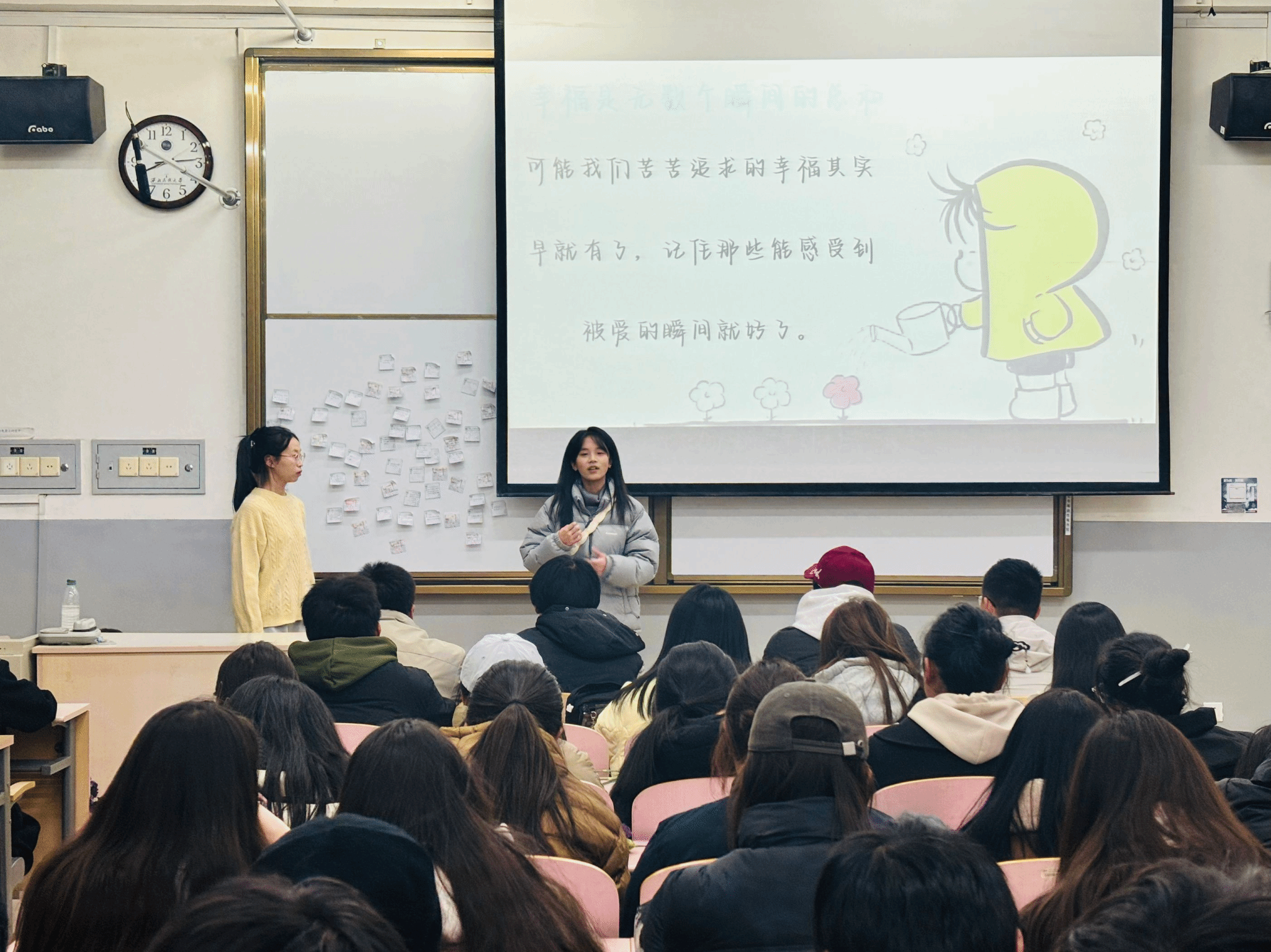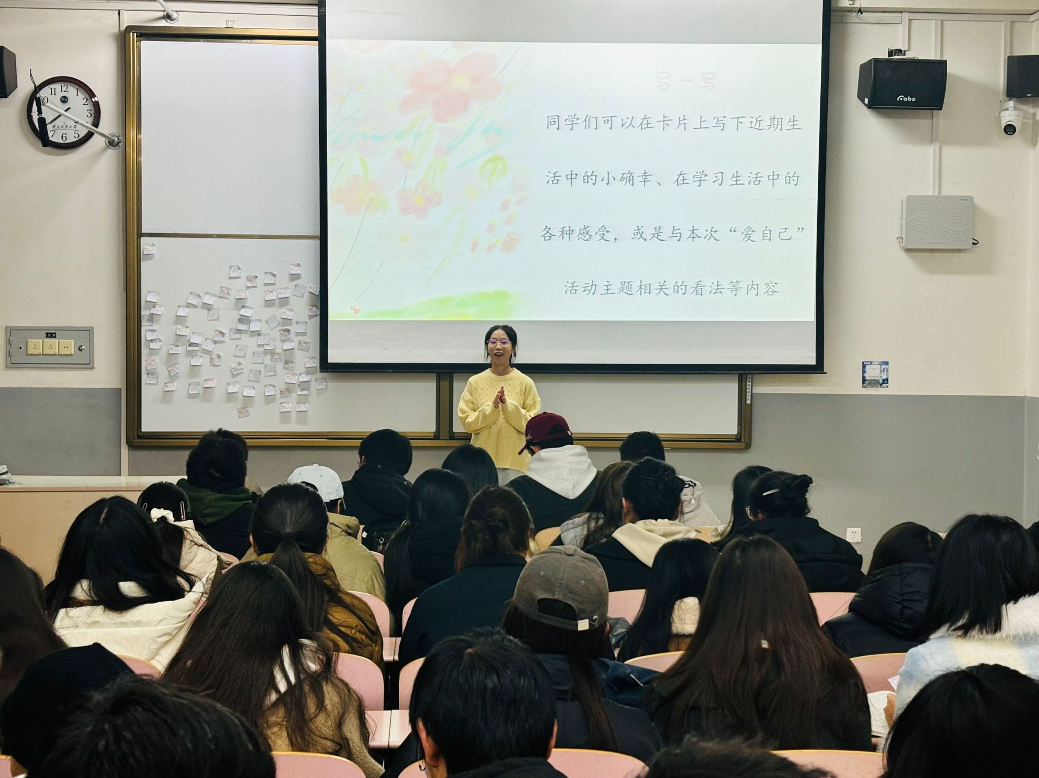 為培養學生熱愛生活、自強自信、樂觀向上的心理品質,中國語言文學學部學生管理辦公室聯合團委心理健康服務部于12月1日在致真樓504舉辦“關愛自我,從心出發”健康成長系列活動,100余名學生參加。