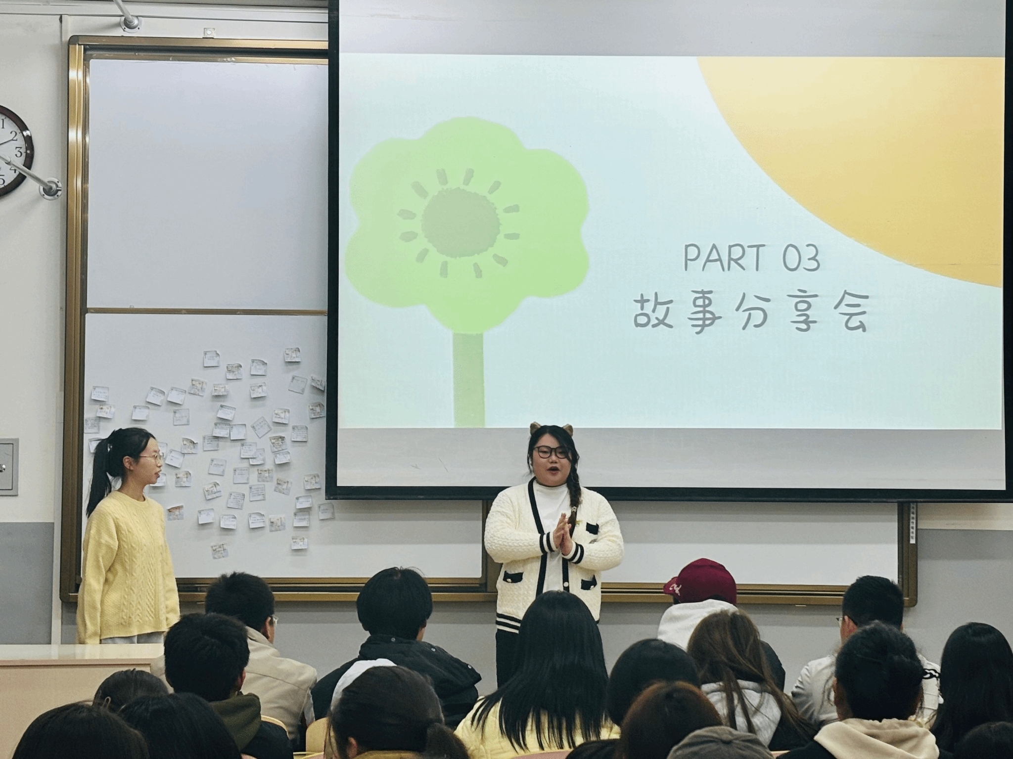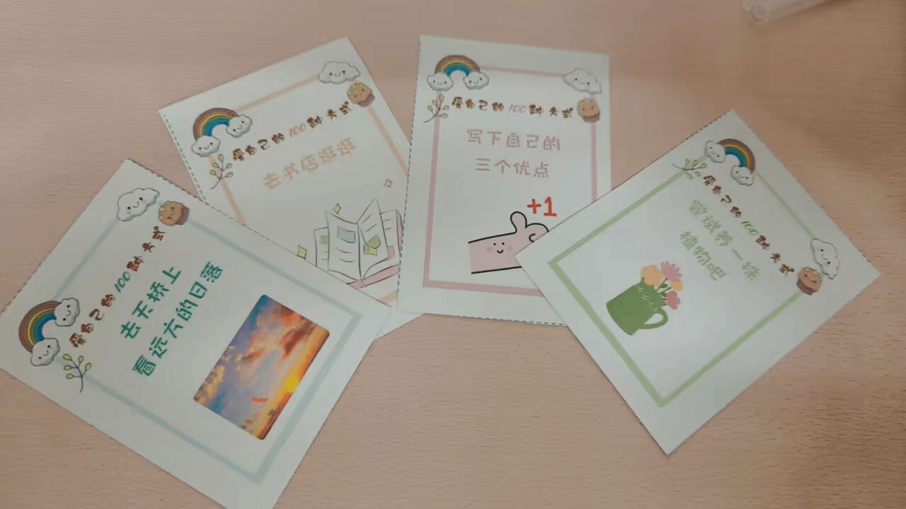 同學們在便利貼上記錄下近期生活中的小確幸及關愛自己的方式,張貼在展板上,抽取“愛自己的100種方式”卡片,彼此分享交流。觀看短片《男孩、鼴鼠、狐貍與馬》,結合自身經歷分享感悟。大家認為,短片中的鼴鼠象征著甜美的童年,狐貍代表現實,白馬是夢想的化身,而小男孩就像每一個在生活中追尋自我的人,只要心懷堅定的愛,就能找到心靈的歸宿。活動結束時,王雅君總結了本次活動的意義并對同學們做出美好祝愿,引導同學們懂得在生活中始終心懷堅韌和樂觀,不斷挖掘和尋找對生活的熱愛,在日常學習與生活中積極關注自我心理健康,提升心理調適能力。