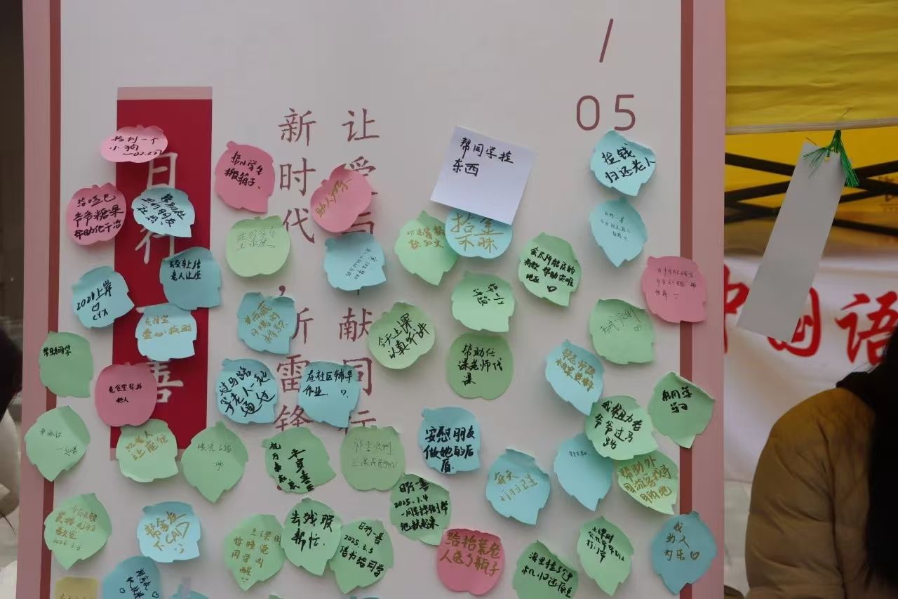 3月5日我們共同參與舉辦雷鋒日"日行一善"擺攤活動,在書寫與閱讀間觸摸到雷鋒精神永不磨滅的溫度。同學(xué)們執(zhí)筆凝思,寫下一字一句。給陌生人指引道路,為災(zāi)區(qū)群眾捐贈物資這些平凡善舉,在便利貼上化作文字溪流,涓滴善意透過筆鋒流淌。當百余張素箋在我們的雷鋒宣傳板上連成"善行長城",《論語》"見善如不及"的箴言在此具象化。這場文字與美德的互文,讓我們領(lǐng)悟:文學(xué)的終極關(guān)懷,終要落回對人間煙火的溫柔注視。