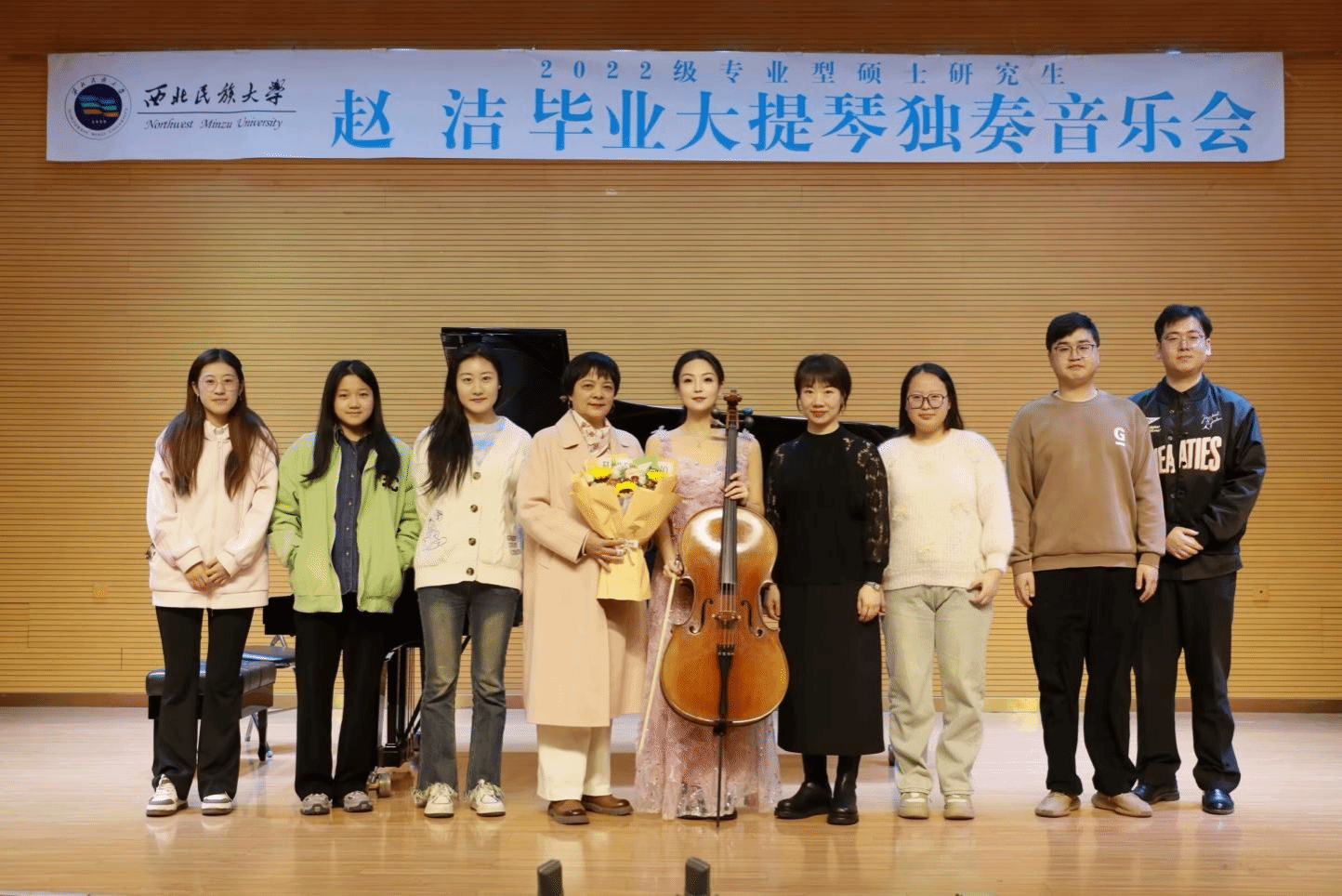 2024年10月21日,2022級專業型碩士研究生趙潔成功舉辦大提琴畢業音樂會。整場音樂會進行了一個小時,共演奏了3首大提琴作品。分別是:沙漢昆《牧歌》海頓《D大調協奏曲》第一、二樂章和肖邦《大提琴g小調奏鳴曲》第一、二樂章。參與本場音樂會的評委老師有李朝華、劉暢、寧輝。音樂會藝術指導由李禎玉老師擔任,主持人孔夏黎。