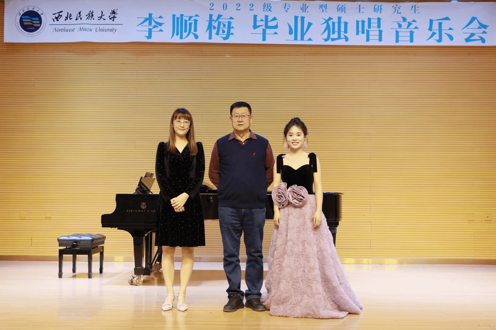 2024年11月1日,2022級專業型碩士研究生李順梅舉辦畢業獨唱音樂會。整場音樂會歷時一小時,共演唱《丟失發針,我多么悲傷》《阿爾卑斯山的牧羊女》《帕米爾,我的家鄉多么美》《我愛你》等十二首作品。其中中國古詩詞藝術歌曲四首,歌劇詠嘆調三首,外國藝術歌曲三首,創作歌曲兩首。本場音樂會藝術指導由郭倩擔任,參加本場音樂會的評委老師有李鳳蓮、趙煒民、朱子健。主持人閆倩。