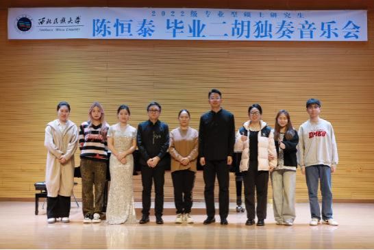 2024年11月12日上午10點,2022級專業型碩士研究生陳恒泰成功舉辦畢業二胡獨奏音樂會。整場音樂會歷時一小時,共演奏《天山風情》《楚頌》《月夜》《初心》四首作品。本場音樂會藝術指導由史洋老師擔任,主持人邵晨;參加本場音樂會的評委老師有劉慧、東保吉、王潔。