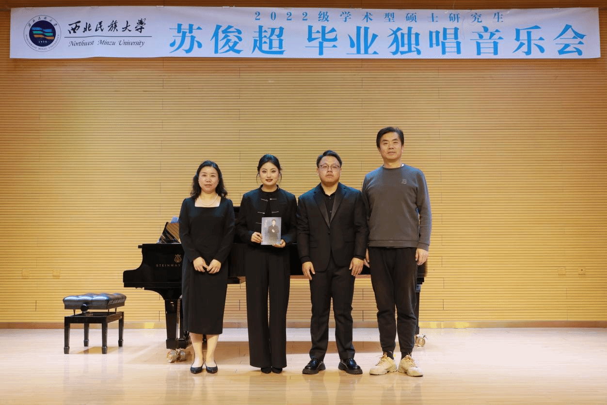 2024年11月15日,2022級學術型碩士研究生蘇俊超舉辦畢業獨唱音樂會。音樂會歷時一個小時,共演唱十二首作品。中文作品六首,分別是:《憶秦娥·恒山月》《父親的草原母親的河》《懷念曲》《關雎》《幽蘭操》《滿江紅》;外國作品六首,分別是:《我懷著滿腔熱情》《別再使我痛苦迷茫》《多么幸福能贊美你》《淚洪》《菩提樹》《母親教我的歌》。張寧寧擔任藝術指導老師,馬睿、韓華、黃錦等三位擔任評委。葉莉秀主持。